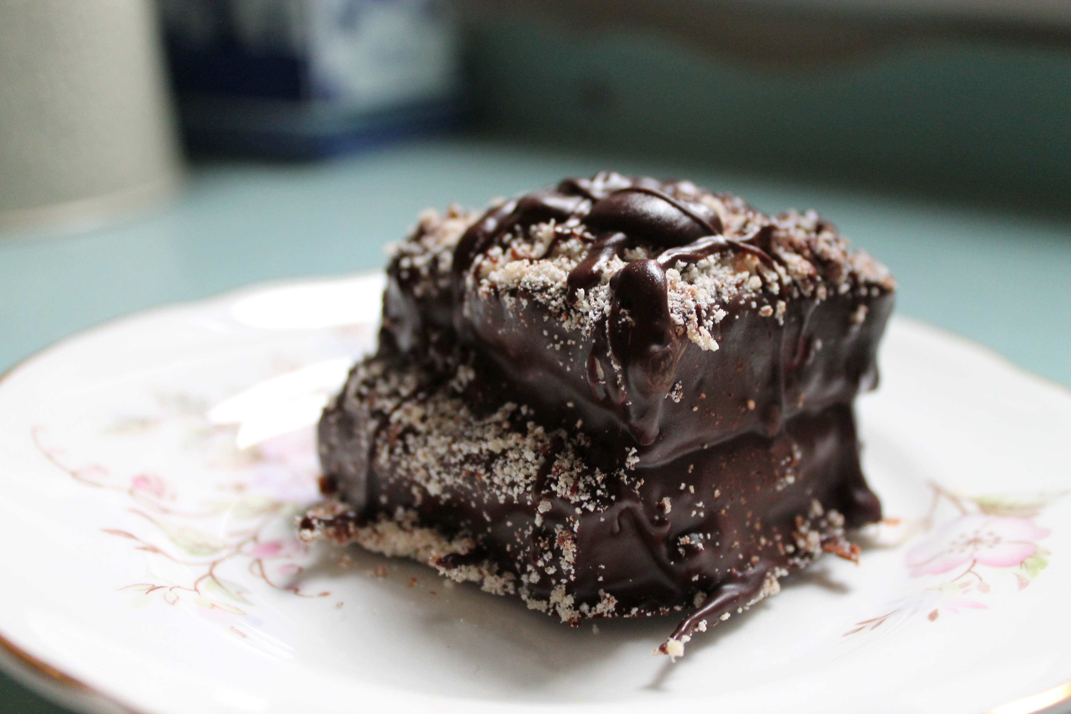 - Shake off the excess and place onto greaseproof paper. Dust with ground hazelnuts.