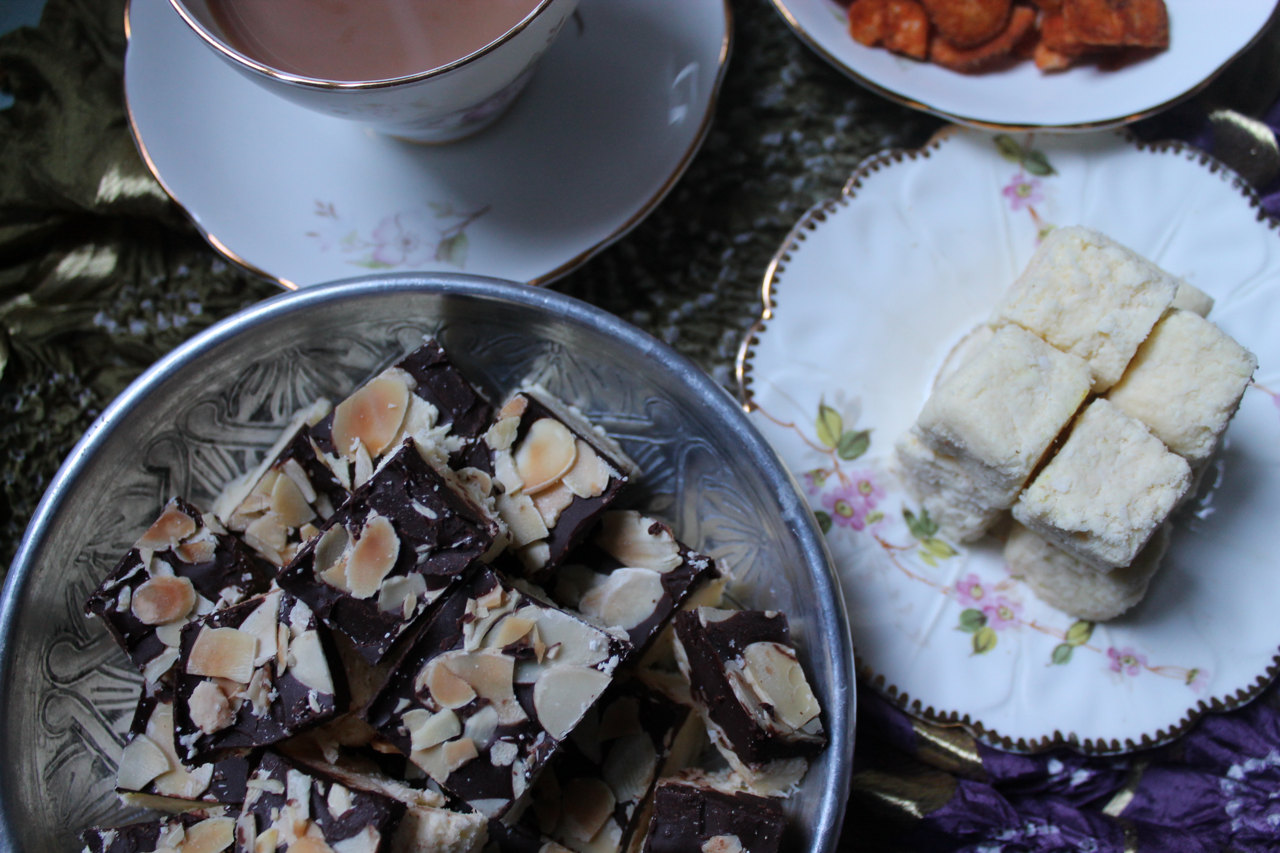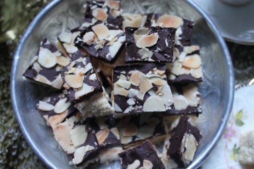 - Melt the chocolate in a bain marie – then pour onto the chilled burfi and sprinkle with the almonds. Leave to set.