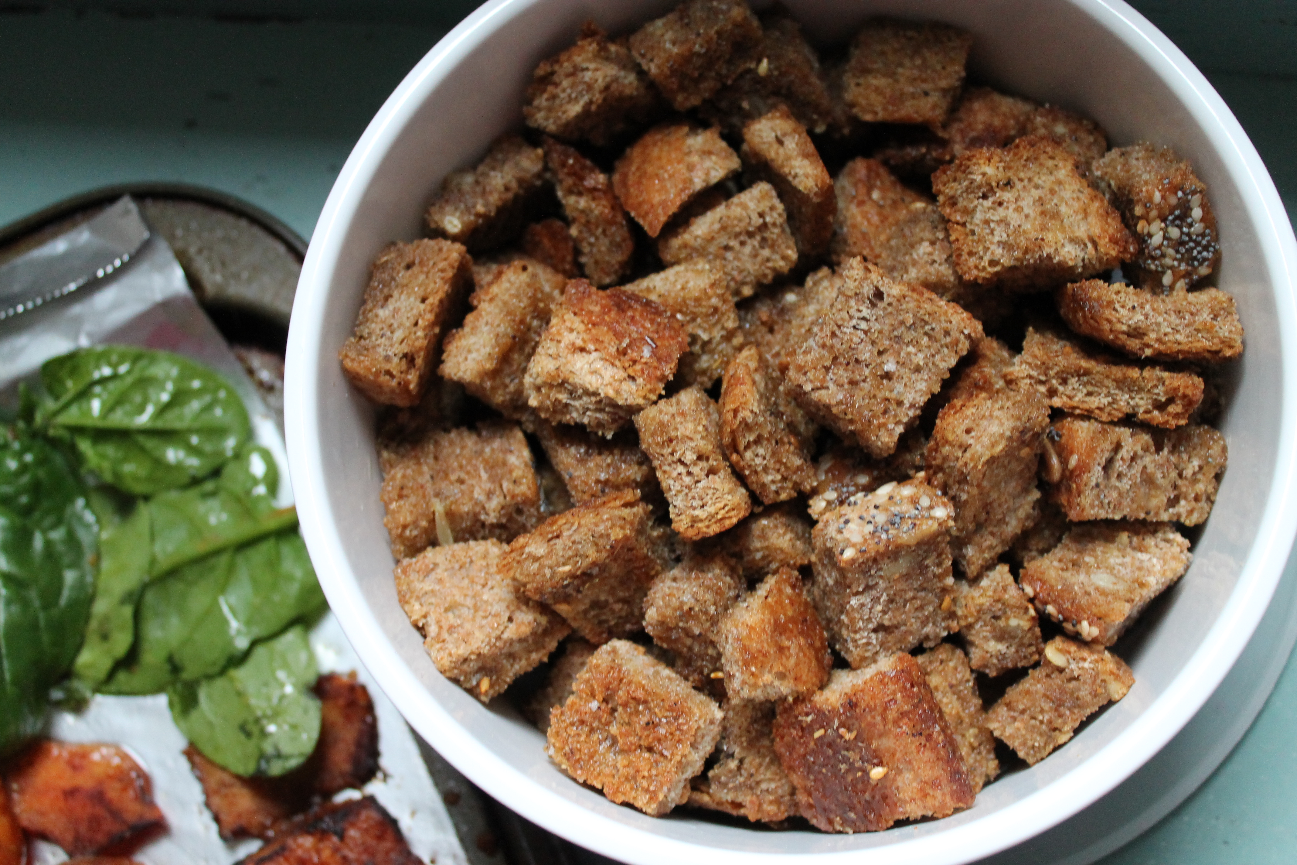 Do you know that 32% of bread purchased by UK households gets thrown out when it could be used? That’s crazy, right? We grew up in a family that hardly wasted anything if we could help it – stale bread was eaten toasted and moldy bread meant the birds in our area got a free lunch. Now that we’ve grown up (a little!), we know that you can do all sorts of things with stale bread – make breadcrumbs, bread and butter pudding or pour hot soup over it. But here’s the easiest and our favourite thing to do with stale bread: make yummy crunchy croutons! With a Middle Eastern twist of course.