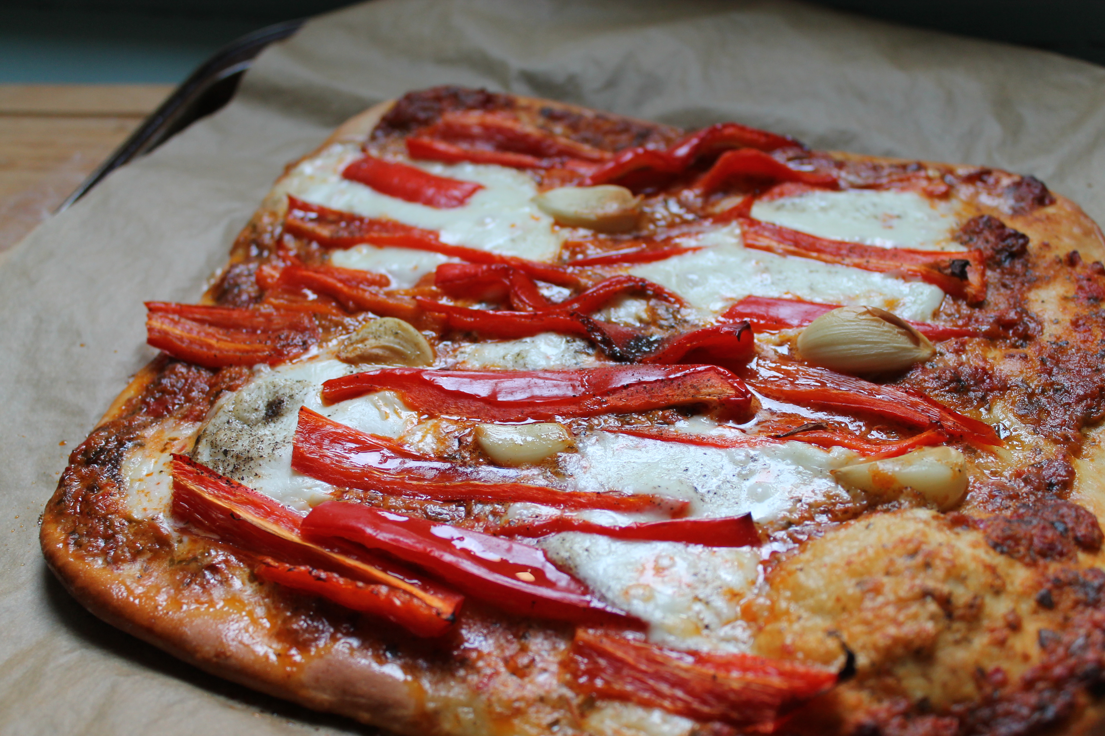 So we’ve just returned from a magical weekend in Rome which has re-ignited our love for pizza and all things carb-related. We usually try to be healthy and exercise some kind of self-restraint, but before we went, we vowed to go to town on Italian food. And we really did. We dined on beautiful pasta, chocolate and nocciola gelato, deep-fried courgette flowers and salt cod (Roman specialities), pizza (of course!) and discovered a cake made up almost completely of Nutella ganache (crostata di gianduia, a true revelation). Now that we’re back in London, it’s fair and accurate to say that we’re avoiding the scales big time. And although we are almost back to our normal routine, we thought we’d remember our trip by creating our own slightly healthier version of the Roman pizza we tried – and made it square (so much easier to divvy up and just like the Roman pizza al taglio!).