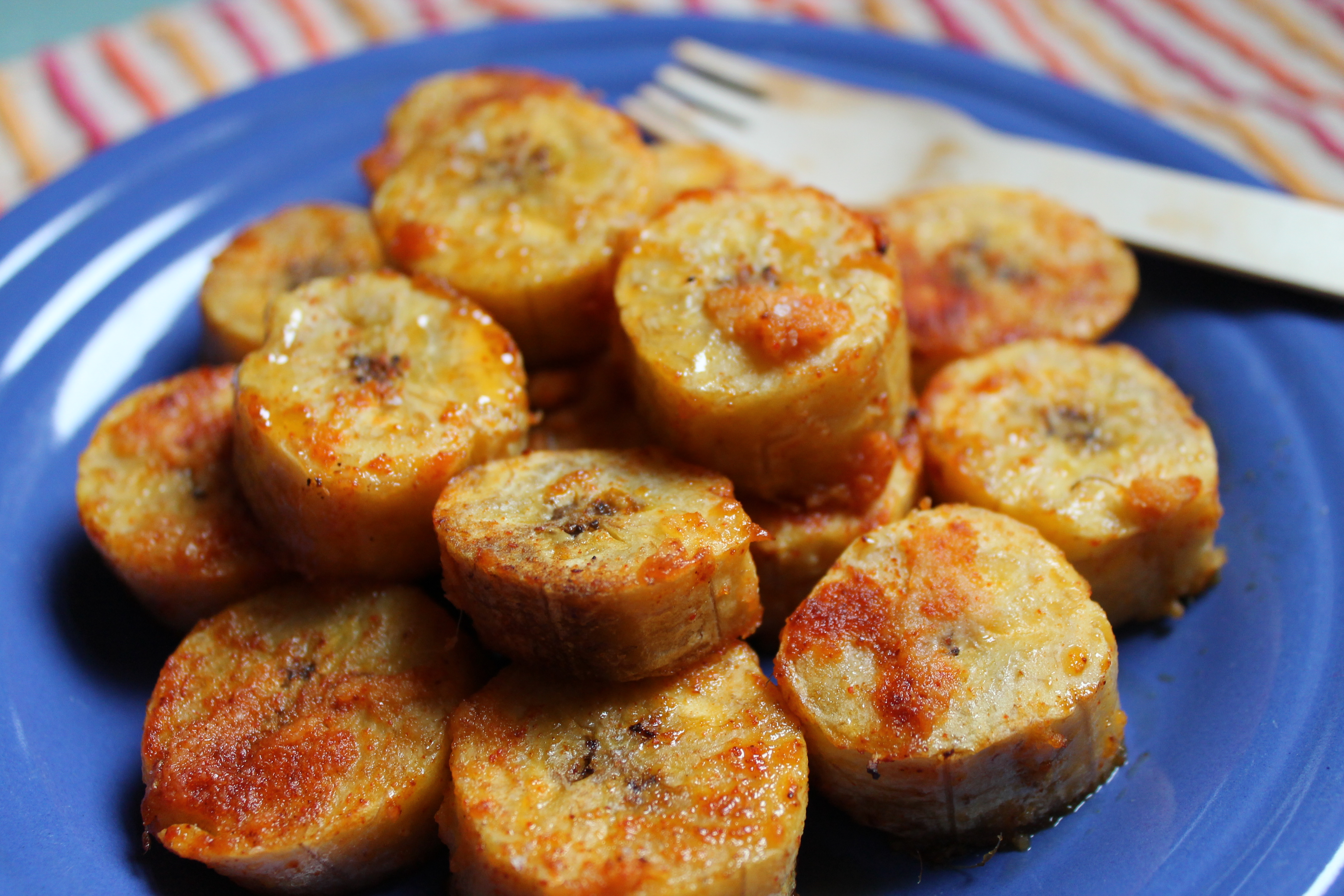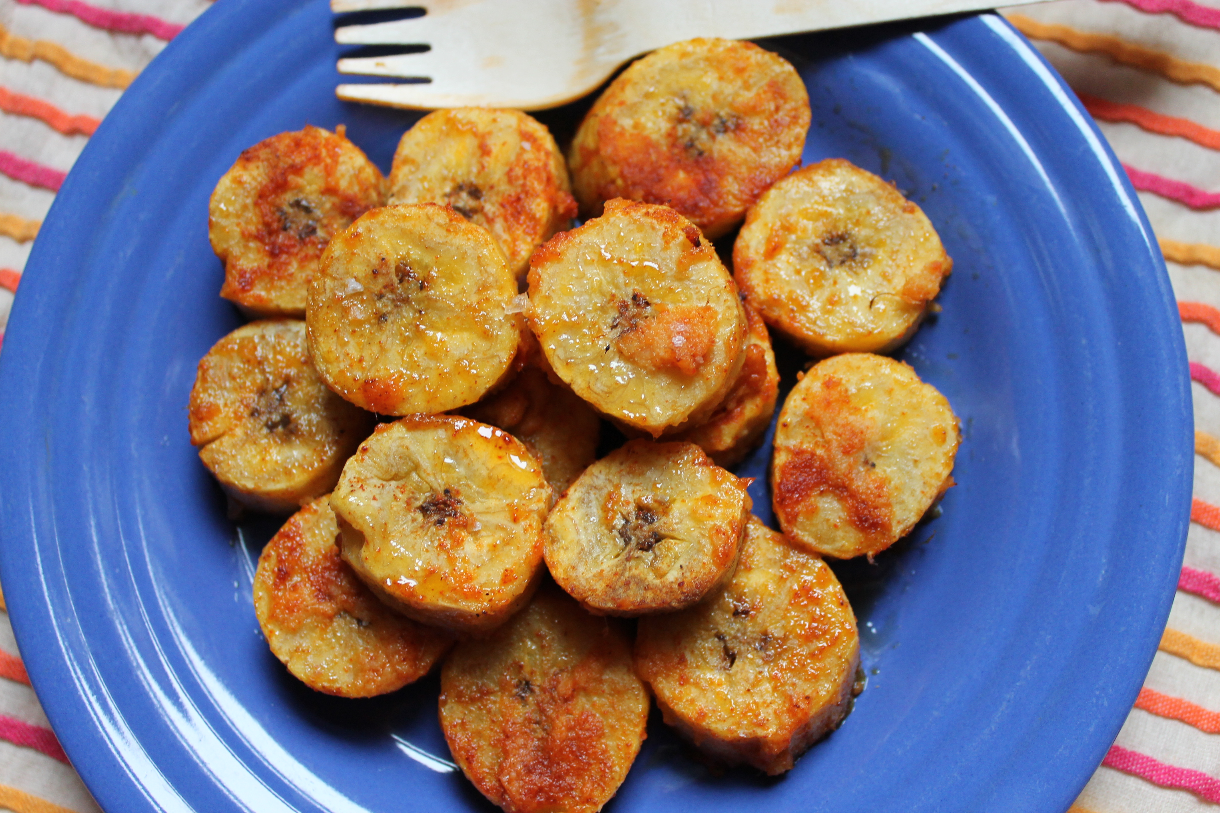 Seeing as it is currently snowing, windy and there’s a biting chill in the air – a dish that could transport us (if only in our imaginations) to a place where the sun is shining sounded perfect. It’s so easy – we sliced very overripe plantains, marinated them in ginger, garlic, paprika and salt and then baked them for 15 minutes. It’s seriously like having street food at home!