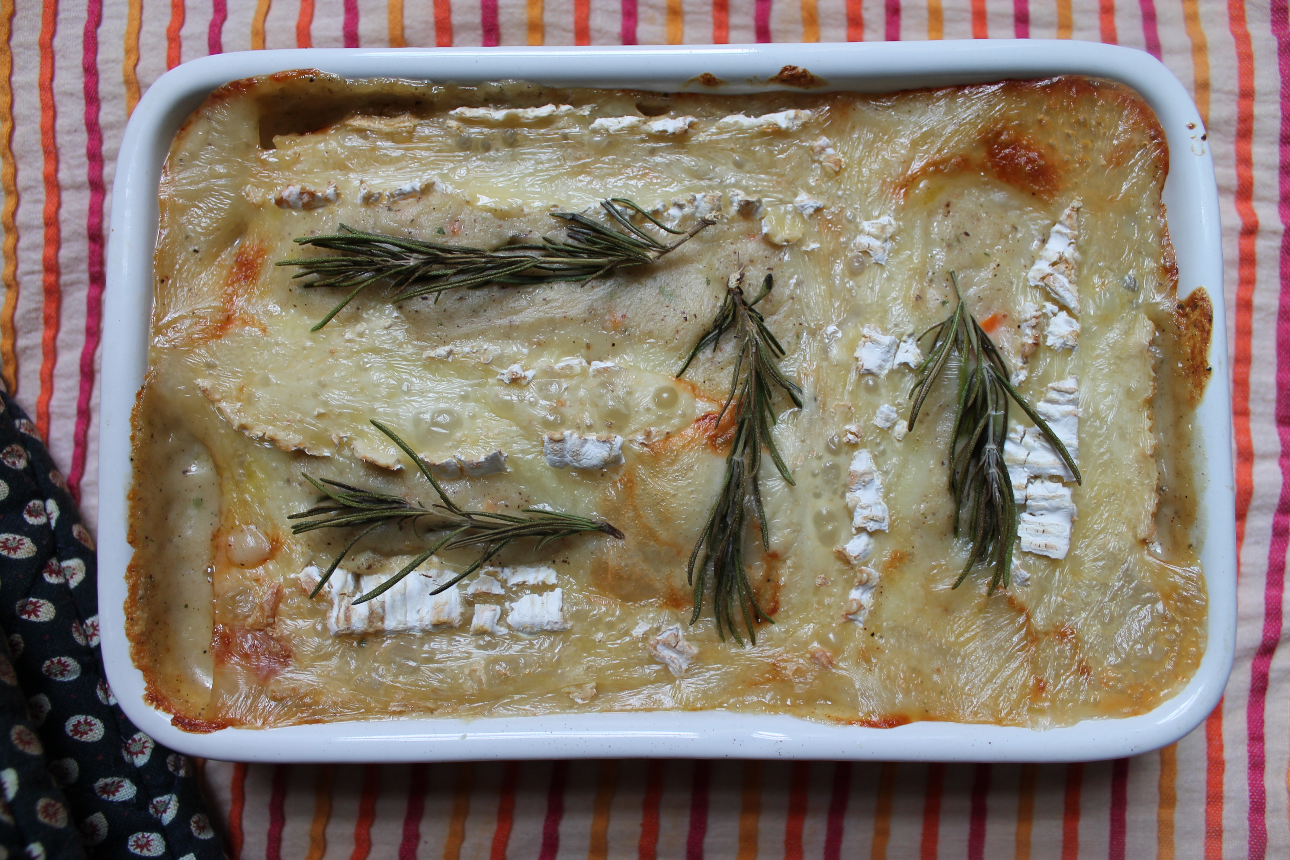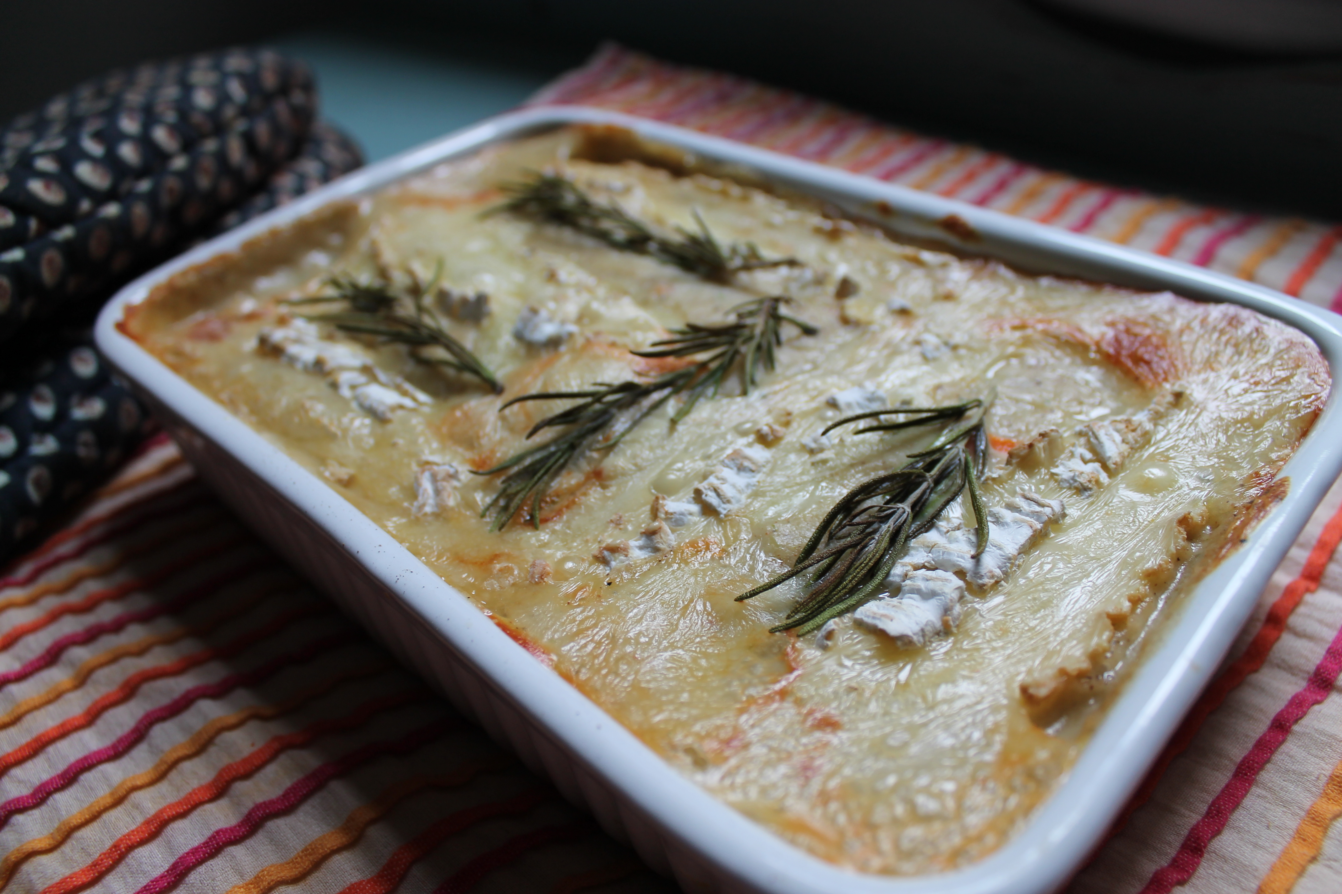 However, we thought we’d change it up a bit as usual and so have substituted sweet potato for the potato, drenched it in a garlicky-rosemary white sauce and covered it all in the strongest French brie we could find. The result is creamy and savoury with a hint of sweetness, good enough to eat out of the baking dish alone – bon appetit!