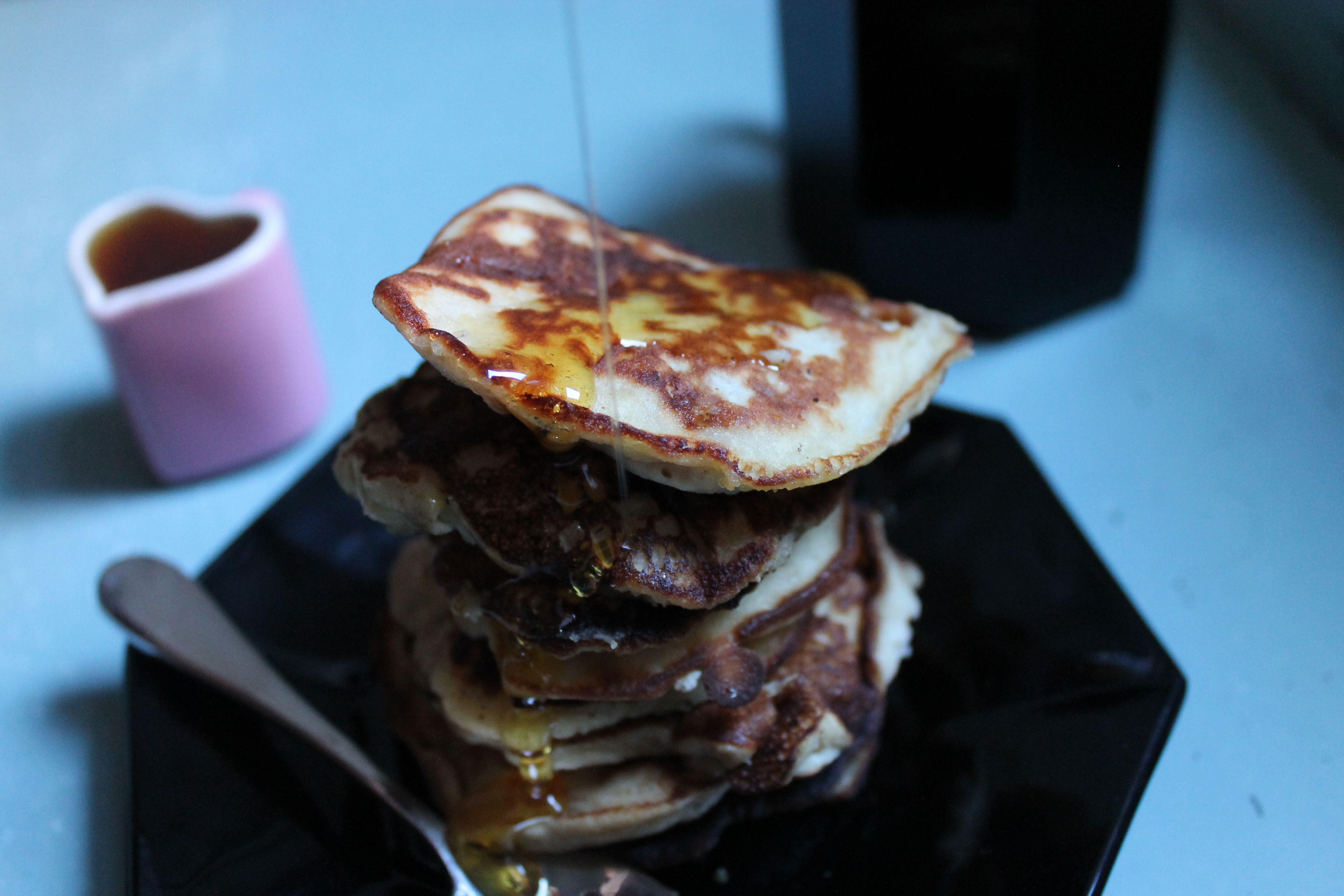Our hack involves replacing the flour with dessicated coconut, banana and almond butter and removing the milk. So you get added protein, good fats, fibre and natural sweetness. Of course, if you want added sweetness, feel free to pour on some organic, unprocessed maple syrup – we did! We also made them mini-sized, perfect for a little snack as well.