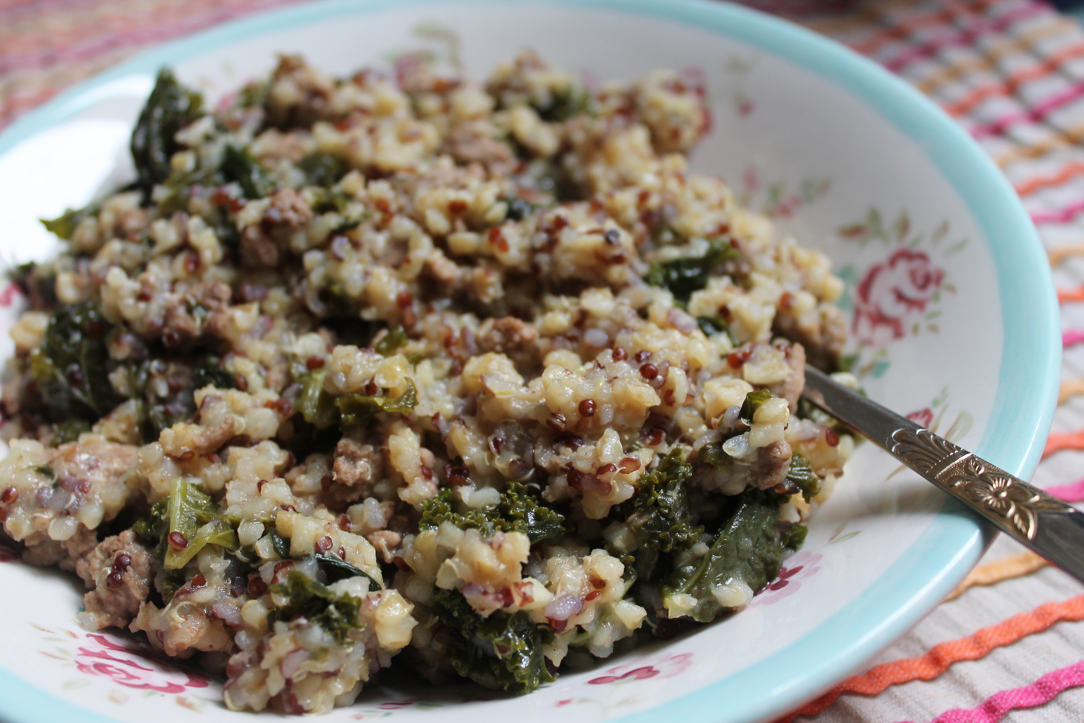 The one thing we can almost always count on is getting ill in the winter – and then getting ill again as the virus makes its way back to us. Normally we rely our Sick Girl foods – spaghetti bolognaise, tomato soup, garlic bread, TUC biscuits and ginger ale – but this time we were craving something a little stodgier and greener. (After all, our immune systems clearly need a boost!) Enter curly kale and spinach – two foods well-known for being rich in vitamin C and other anti-oxidants, which we picked up at last week’s farmer’s market. Now, because they have distinctive flavours, we decided to cook them down in lamb stock and added minced lamb and creamy quinoa/bulgur for protein and stodge – a wonderful warming dish. The concept is similar to khichadi, an Indian ayurvedic dish made with lentils and rice that we were always given when we were little Sick Girls – but for meat eaters. Of course if you’re veggie, you can easily use vegetable stock and leave out the meat as it isn’t necessarily the star of the dish.