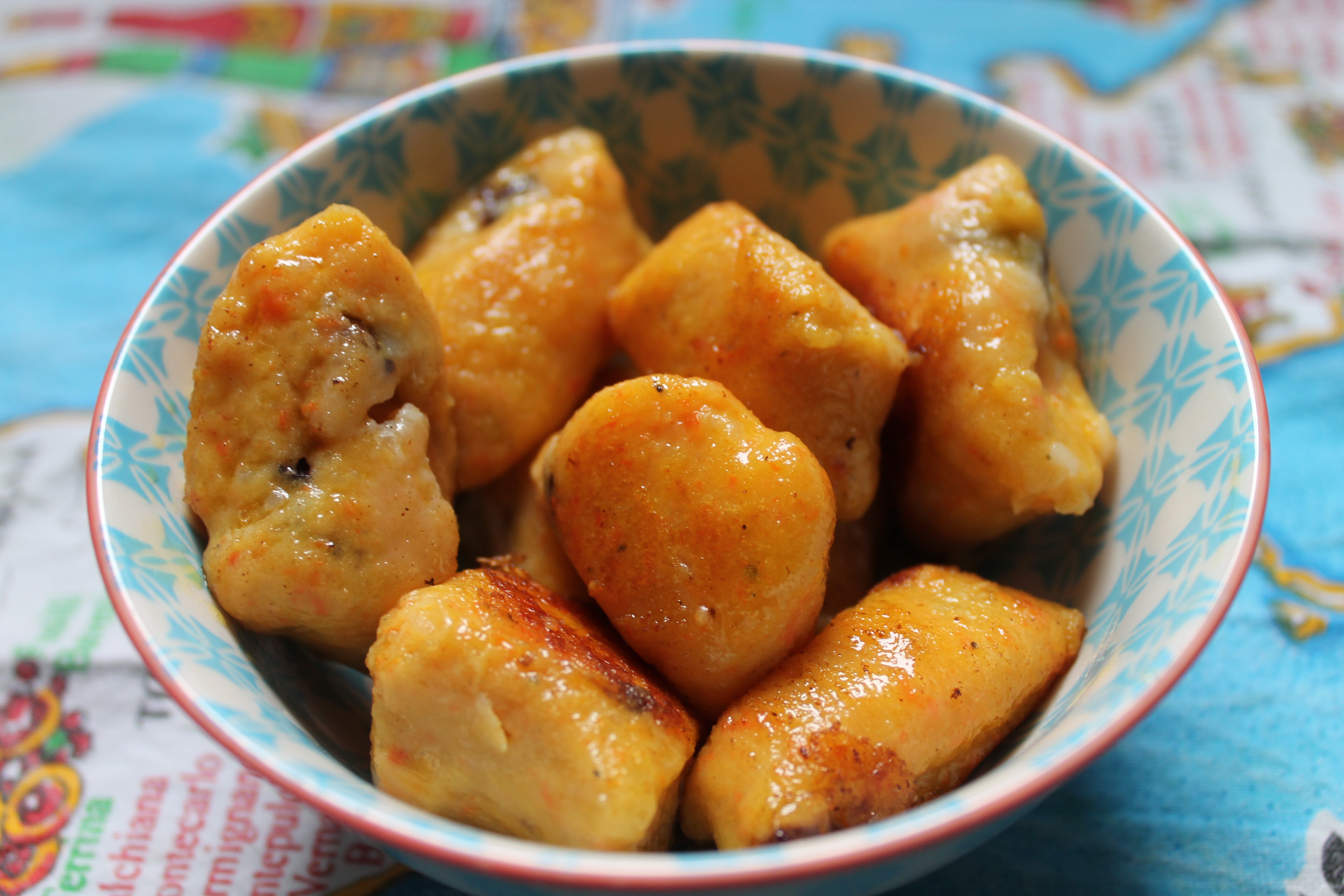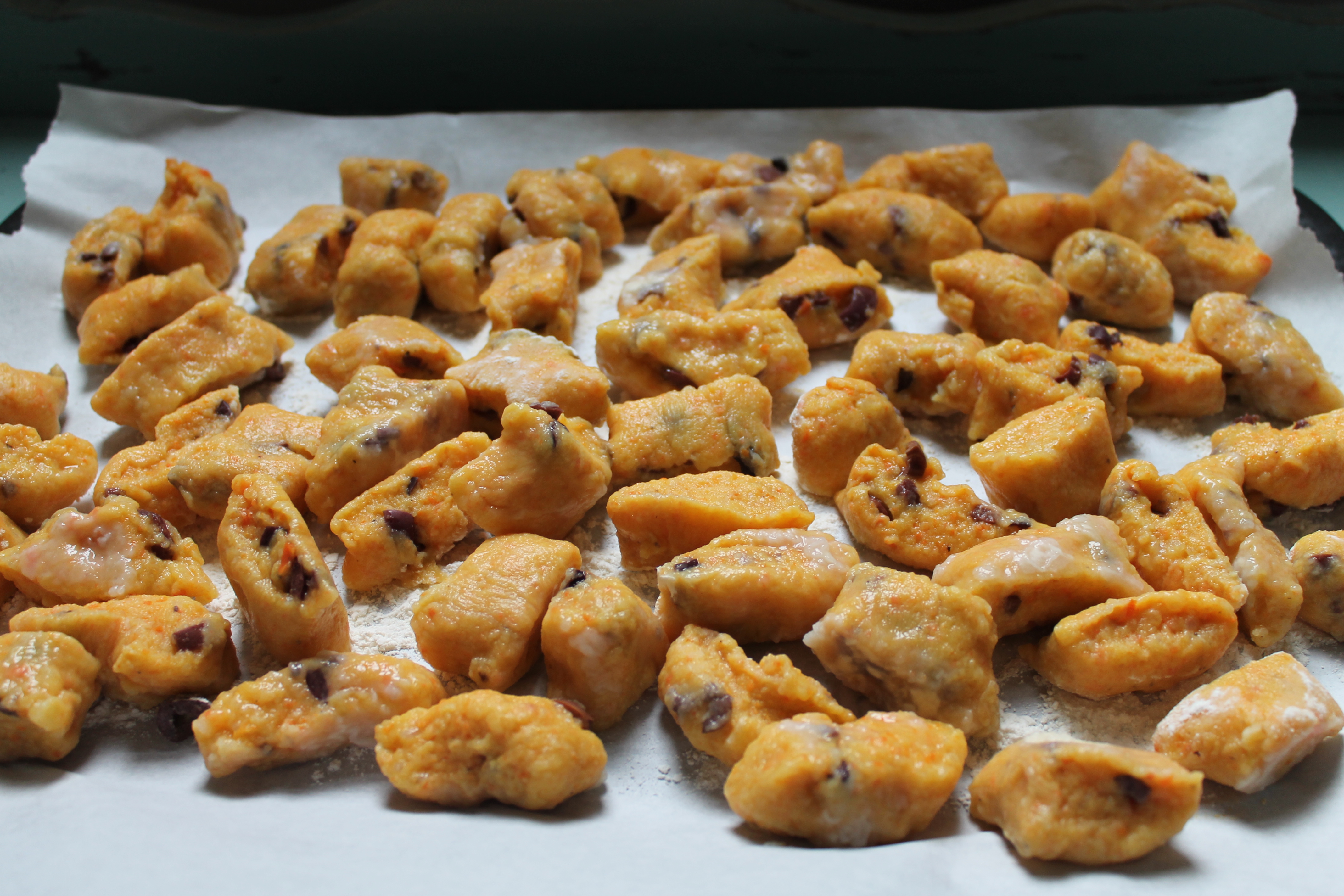 You know the saying, “When life gives you lemons, make lemonade”? Well, when life gives you rapidly aging carrots, you make Carrot Gnocchi. And you throw in some black olives for good measure! We were inspired both by Maria Elia’s Greek version Anchal learned at Leith’s last week and Mark Bittman’s New York Times recipe – both of whom are fabulous chefs. Carrot and black olive is an interesting mix of sweetness and saltiness, and the spices add a bit more depth to the gnocchi. Perfect to eat by itself or perhaps with pesto or a tomato sauce. Buon appetito!