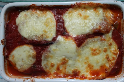 - In a medium baking dish, add the chicken thighs and lay the aubergine slices on top of the chicken thighs.