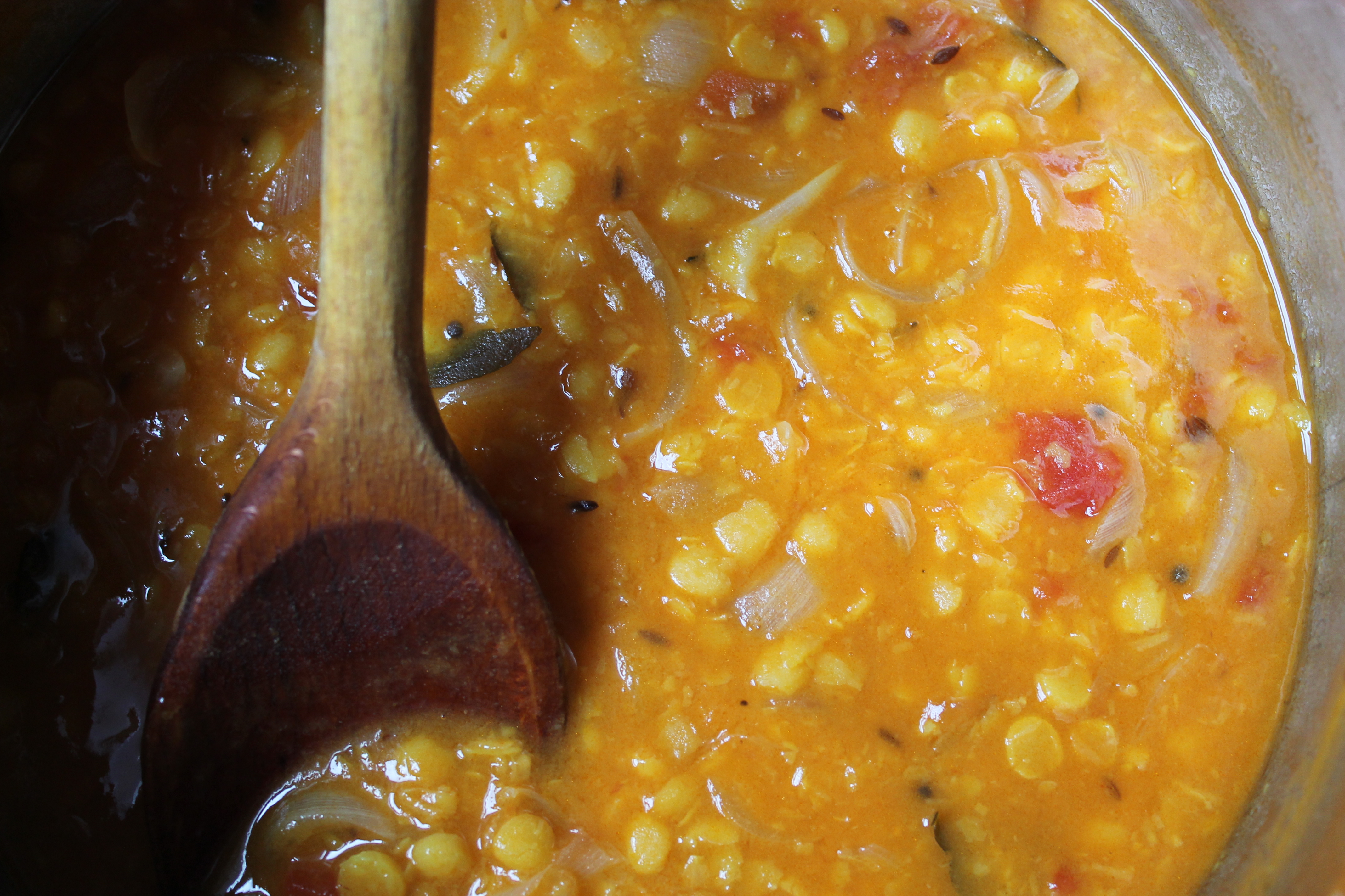 - Add the tomatoes and stir over a medium-low heat for 2 minutes. Pour the contents of the frying pan into the dal and stir through.